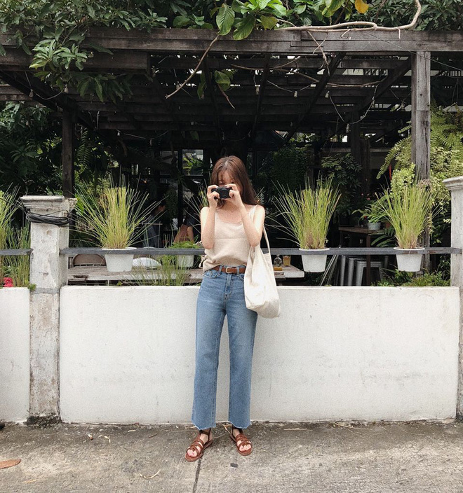 Bộ đôi áo 2 dây + quần jeans trông sẽ mát mẻ và trẻ trung hơn khi bạn chọn áo có gam màu tươi sáng như trắng, kem, be… Quần jeans xanh cơ bản ắt là lựa chọn phổ biến nhất nhưng bạn có thể “đổi gió” bằng quần jeans trắng, vừa mát mắt lại vừa tươi mới.